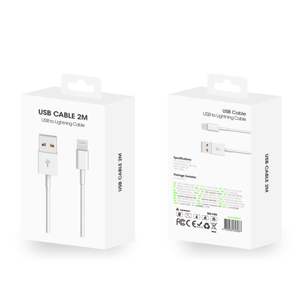 200 cm USB‑A to Lightning cable (white) US2002M in retail packaging. PVC construction, long reach for flexible use; compatible third‑party cable designed for Apple devices. Quality: compatible.