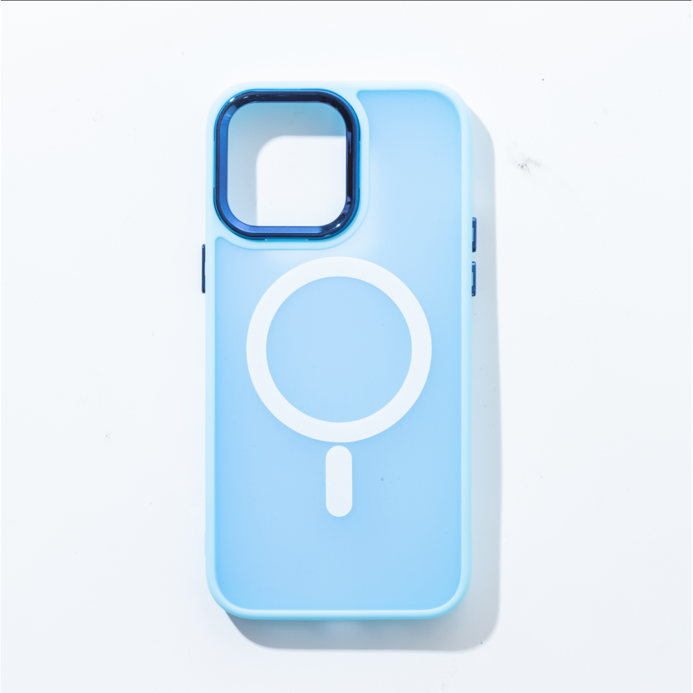 Pastel blue magnetic case for iPhone 13 Pro Max. MagSafe‑compatible magnetic alignment, protective TPU/PC construction, exact cutouts for ports and camera and lightweight profile that preserves the phone’s silhouette.