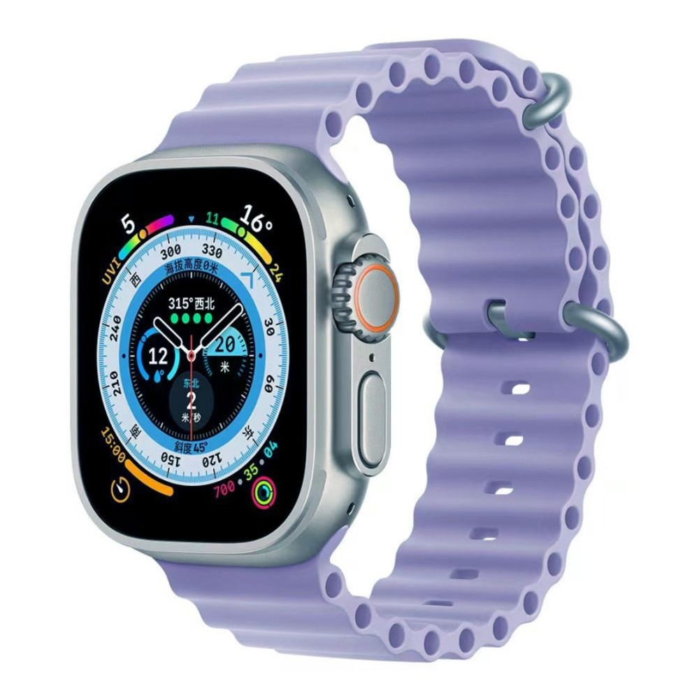 Lilac purple breathable silicone strap for Apple Watch 42/44/45/49mm (M/L). Flexible, sweat‑resistant silicone with breathable perforations, secure pin‑and‑tuck closure and easy installation.