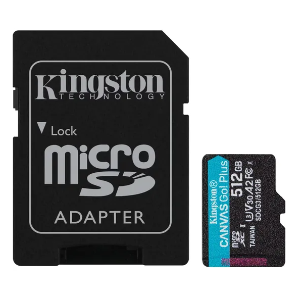 Kingston Canvas Select Plus 64GB microSD (Class10, A1) with adapter; reliable for photos and Full HD video recording.