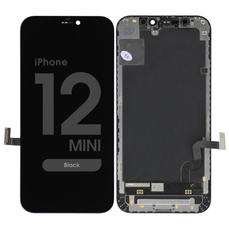 In-Cell Super Retina XDR OLED display assembly, black bezel, includes frame; integrated touch sensor for slim assembly. Compatibility: iPhone 12 Mini (A2176/A2398/A2400/A2399).