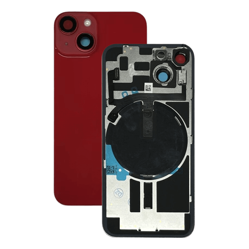 Complete rear housing with all small parts, excludes battery and back camera; Red finish; compatible with iPhone 14 Plus (A2632/A2885/A2886/A2887/A2888).