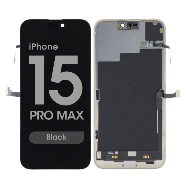 Service Pack LTPO Super Retina XDR OLED display assembly with proximity sensor flex, diagnostics supported; includes frame and original parts for professional repair. Compatibility: iPhone 15 Pro Max.