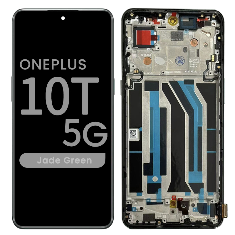Service-pack complete display with frame for OnePlus 10T 5G CPH2415 (2011100418) in Jade Green; pre-assembled for straightforward replacement.