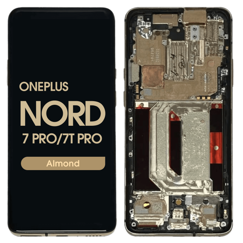 Complete display and frame for OnePlus 7 Pro in Almond Gold; service-pack pre-fitted module for replacement.