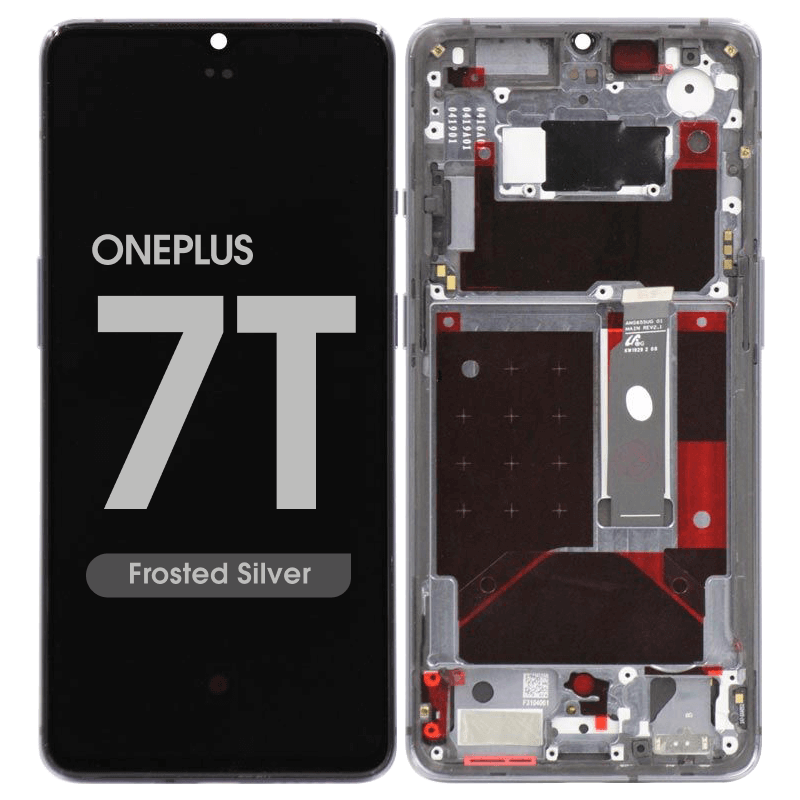 Service-pack complete display and frame for OnePlus 7T in Glacier Blue; pre-assembled module for direct replacement.