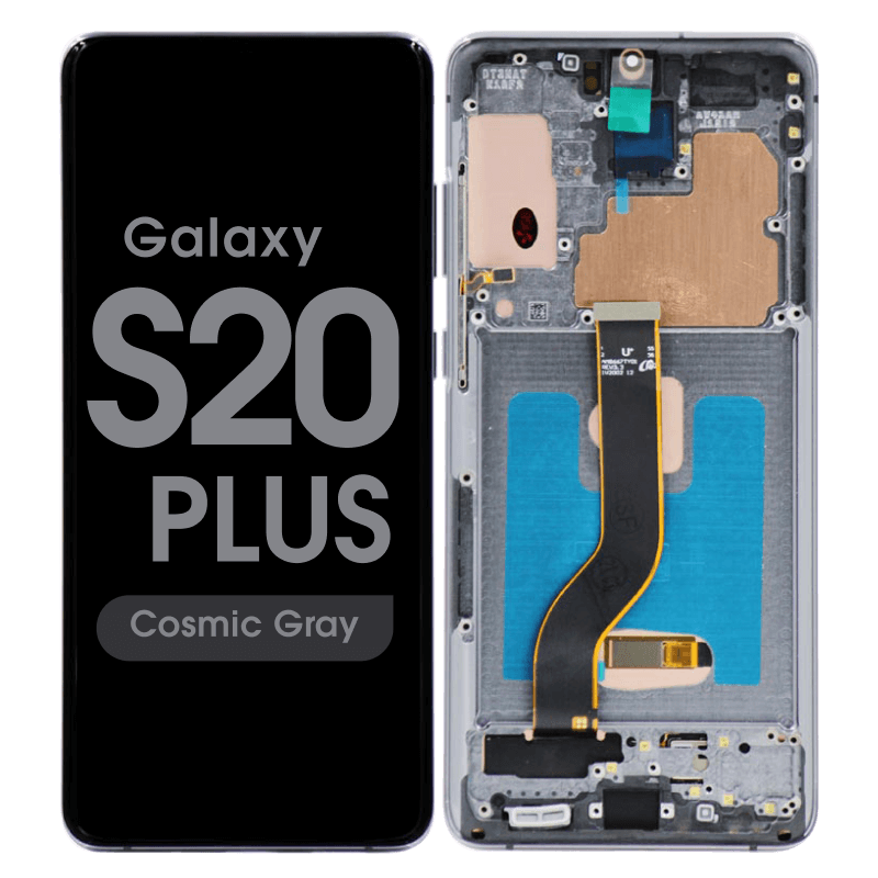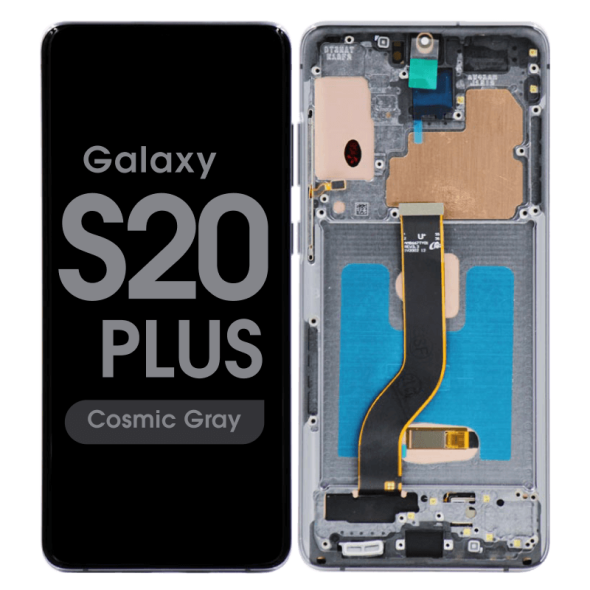 Dynamic AMOLED 2X 6.7" 1440x3200 complete display with frame for Galaxy S20 Plus SM‑G985F/G986F in grey; soft OLED quality.