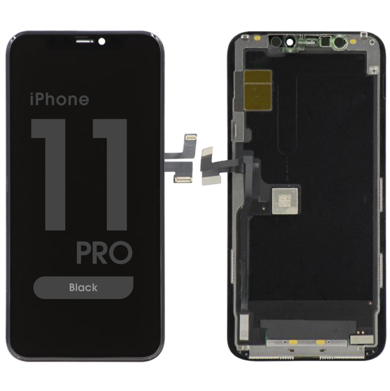 Refurbished Super Retina XDR OLED display assembly, 1125×2436, includes frame; restored and tested, True Tone rewrite may be limited. Compatibility: iPhone 11 Pro (A2160/A2215/A2217).
