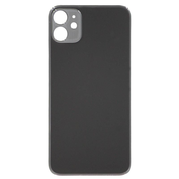 Black replacement back cover for iPhone 11 with enlarged camera frame. Built for durability and precise fit, it restores the phone’s original look and protection—ideal for professional repairs.