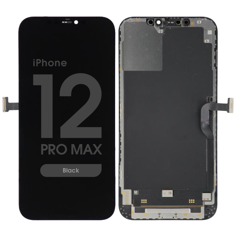 Soft‑OLED display and Touchscreen assembly, premium with removable IC, 60Hz, includes frame; OLED option. Compatibility: iPhone 12 Pro Max (A2411/A2342/A2410/A2412).