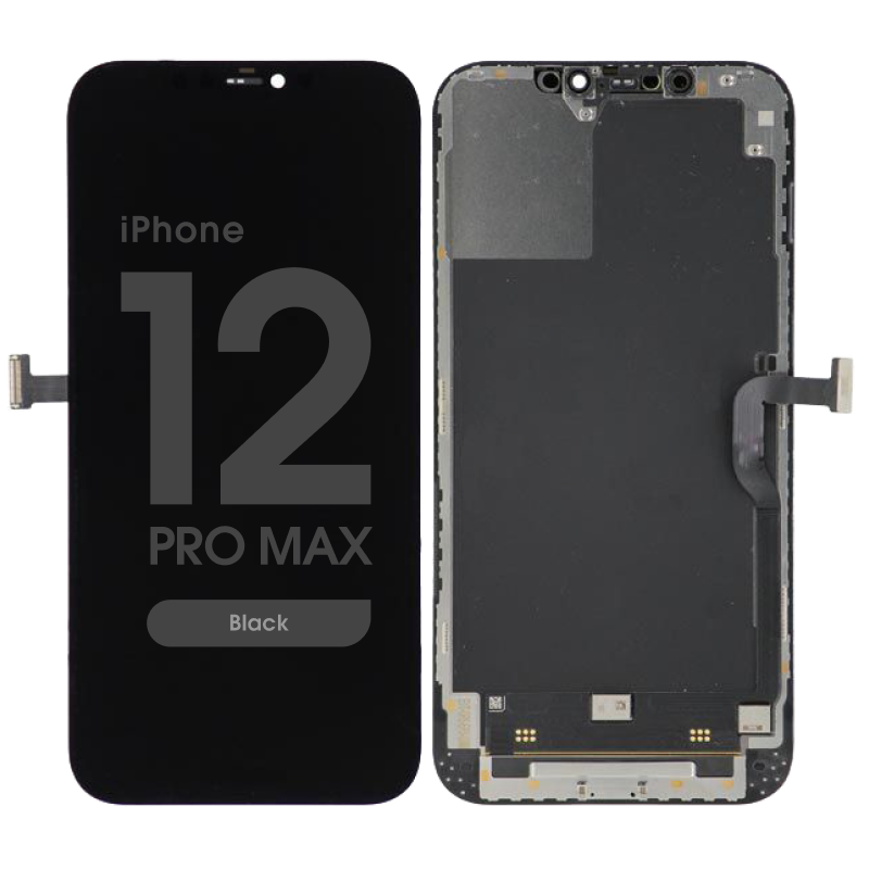 Pulled Super Retina XDR OLED display assembly, 1284×2778, includes frame; restores OLED display and touch. Compatibility: iPhone 12 Pro Max (A2342/A2410/A2411/A2412).
