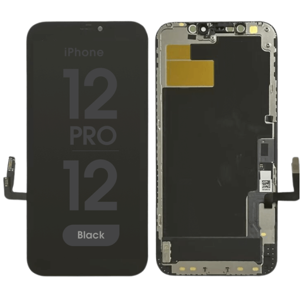 Hard‑OLED display and Touchscreen assembly, premium with removable IC, 90Hz, includes frame; Compatible-style replacement for both models. Compatibility: iPhone 12 / 12 Pro (multiple model codes).