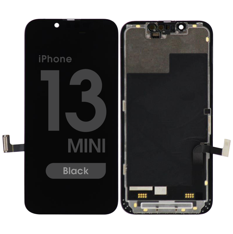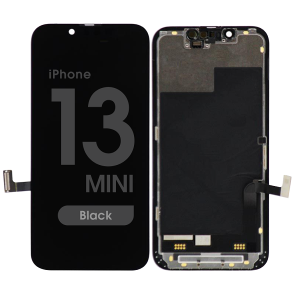 Soft‑OLED display and Touchscreen assembly, premium, includes frame; OLED option for various model codes. Compatibility: iPhone 13 Mini (A2628/A2481/A2626/A2629/A2630).