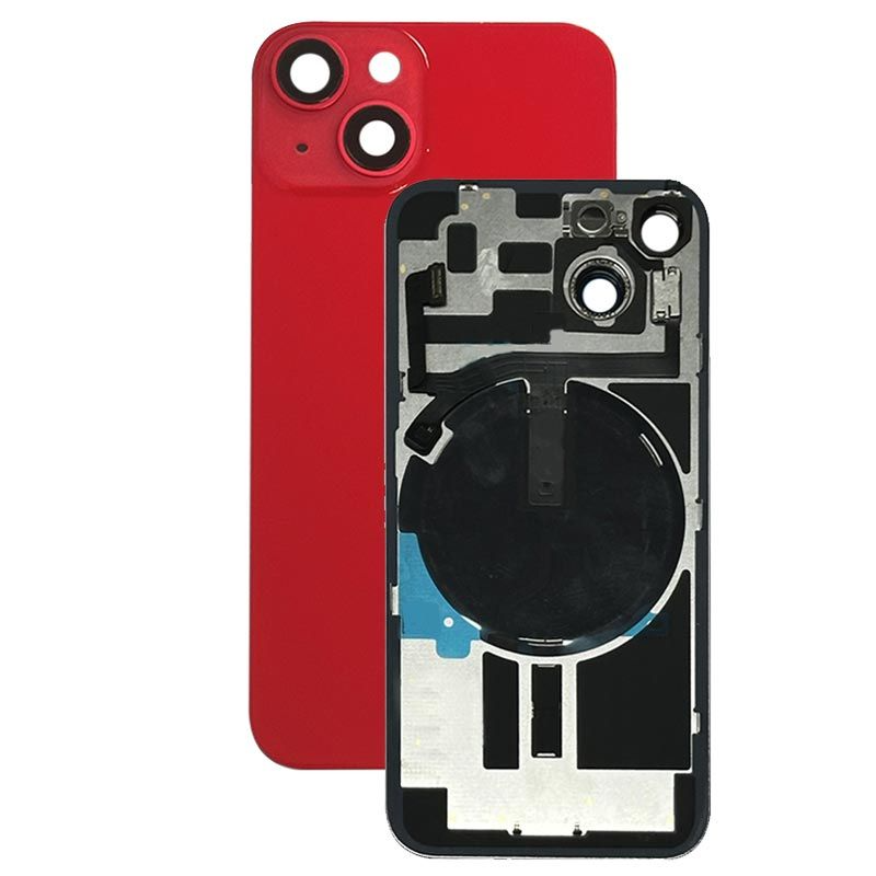 Complete rear housing with all small parts, excludes battery and back camera; Red finish; compatible with iPhone 14 (A2649/A2881/A2882/A2883/A2884).
