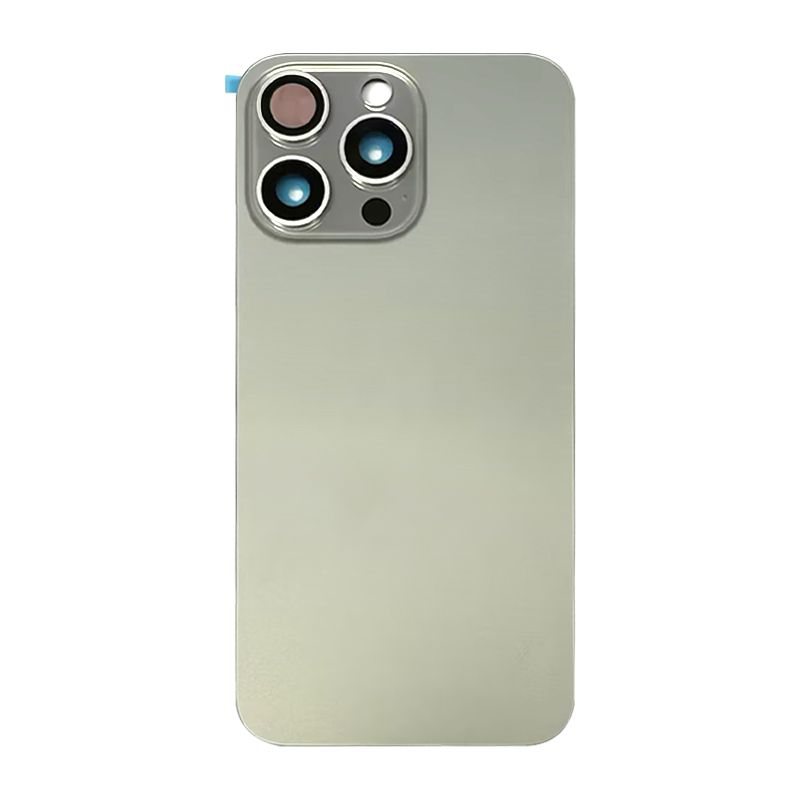 Complete rear housing with all small parts, excludes battery and back camera; Natural Titanium finish; compatible with iPhone 15 Pro Max (A2849/A3105/A3106/A3108).