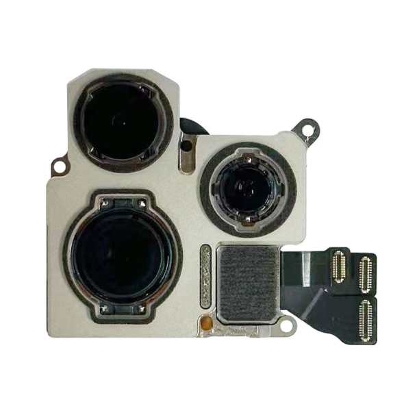 Rear camera set for iPhone 15 Pro (48MP wide + tele + ultrawide + LiDAR) with sensor-shift OIS; pulled condition; compatible with model codes A2848/A3101/A3102/A3104.