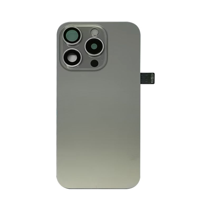 Complete rear housing with all small parts, excludes battery and back camera; Natural Titanium finish; compatible with iPhone 15 Pro (A2848/A3101/A3102/A3104).