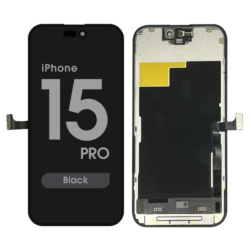 Pulled LTPO Super Retina XDR OLED display assembly, 120Hz, HDR10/Dolby Vision, max brightness up to 2000 nits; includes frame; restores display and touch. Compatibility: iPhone 15 Pro (A2848/A3101/A3102/A3104).