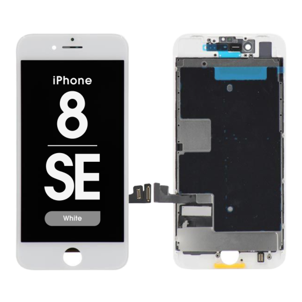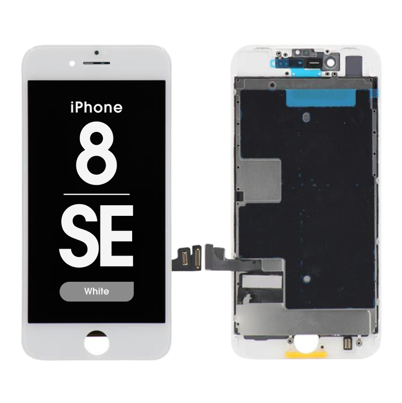 Refurbished LED-backlit IPS display assembly, 750×1334, white bezel, includes frame; restored and tested, True Tone rewrite may be limited. Compatibility: iPhone 8 / SE (2020) (A1863/A1906/A1907/A1905/A2595/A2782/A2783/A2784/A2785).
