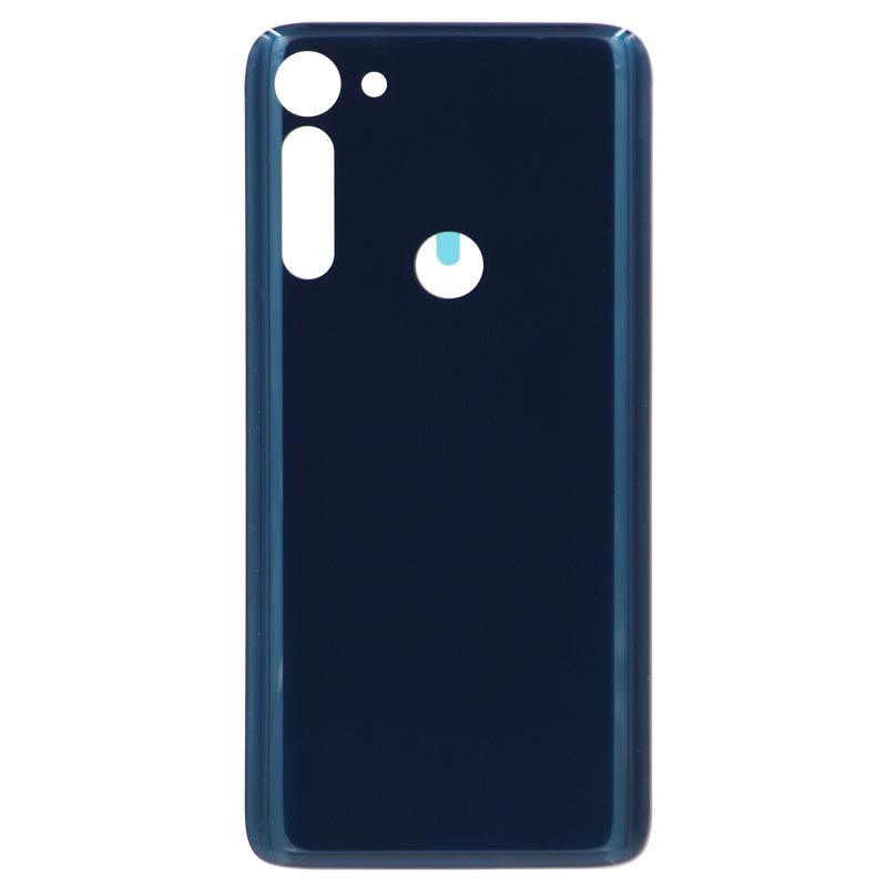Service-pack back cover in Neon Blue for Moto G8; replacement shell without lens, checked for alignment and surface consistency.