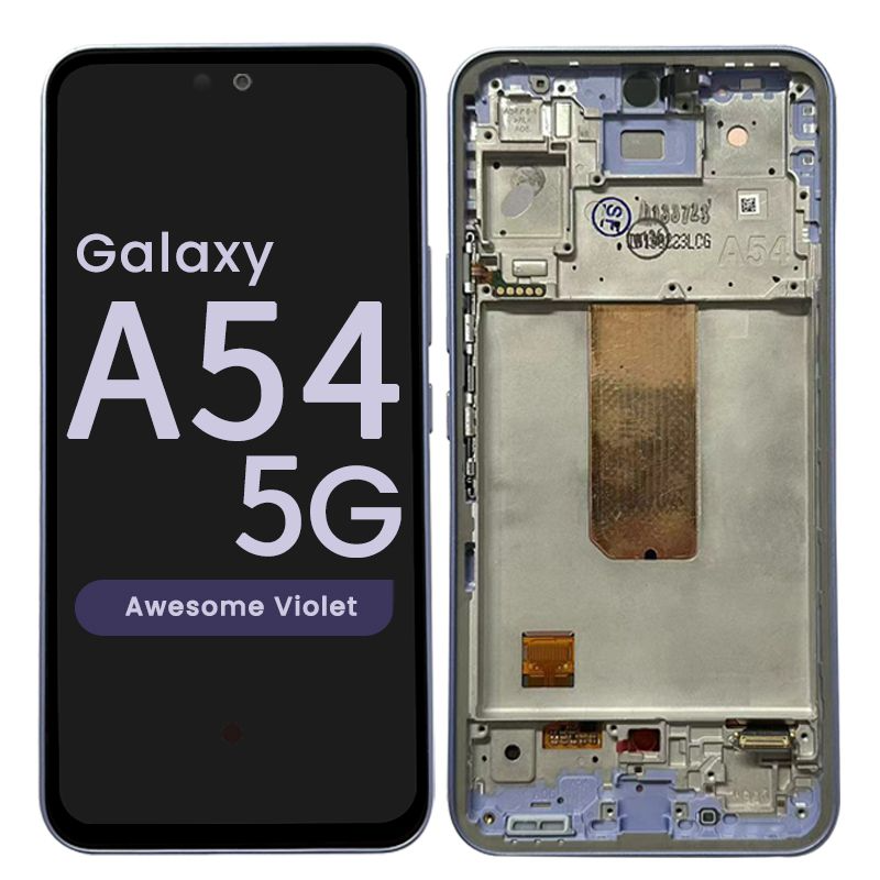 Super AMOLED 6.4" 120Hz HDR10+ 1080x2340 complete display with frame for Galaxy A54 A546B in purple; soft OLED quality.