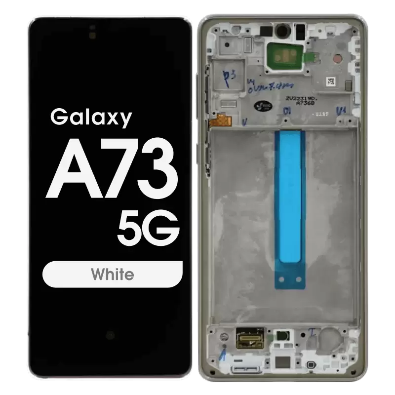 Super AMOLED Plus 6.7" 120Hz 1080x2400 complete display with frame for Galaxy A73 5G SM‑A736B in white; Gorilla Glass 5; service pack quality.