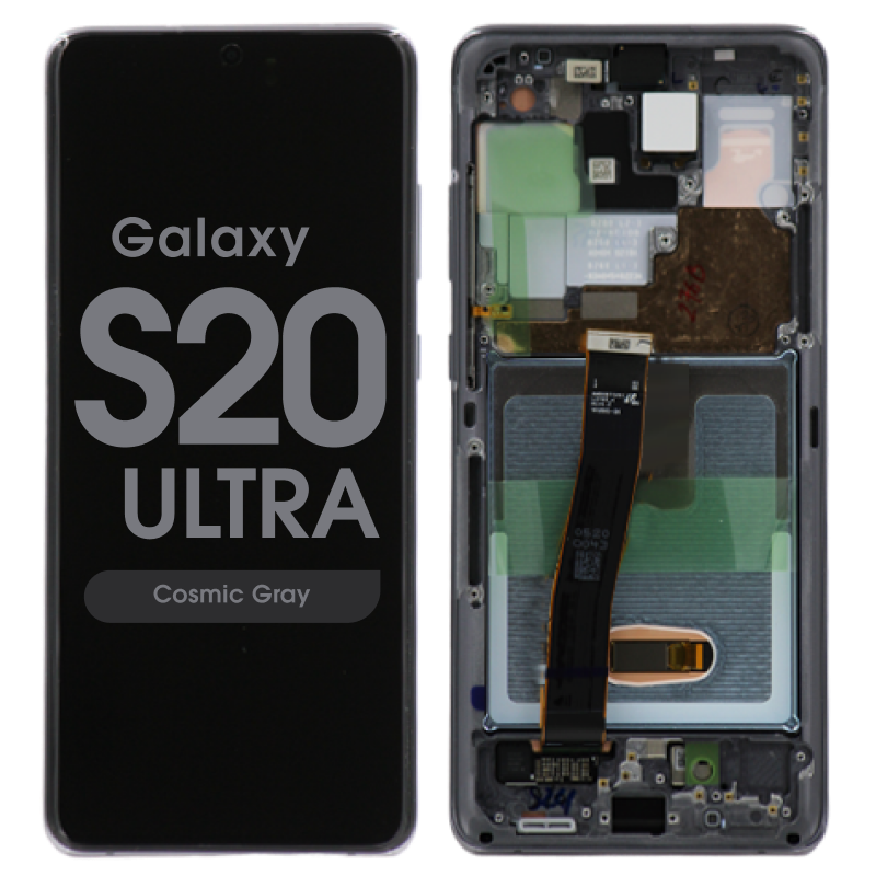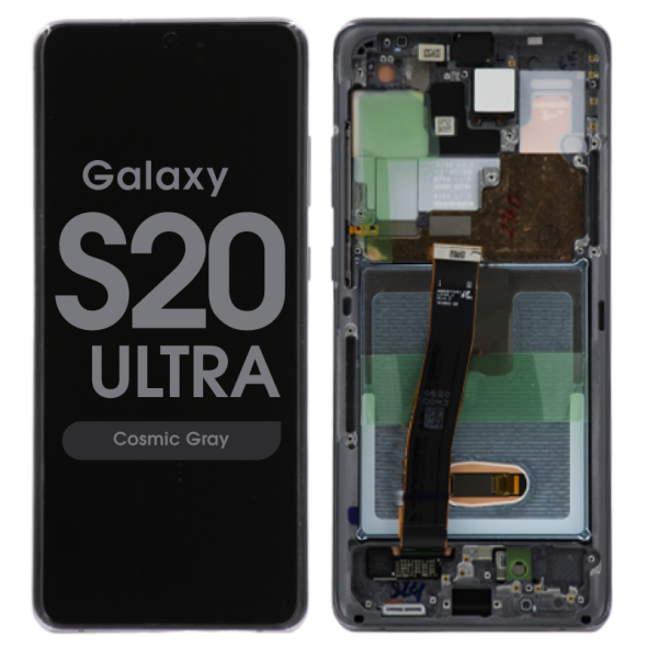 Dynamic AMOLED 2X 6.9" 1440x3200 complete display with frame for Galaxy S20 Ultra SM‑G988B in grey; service pack quality.
