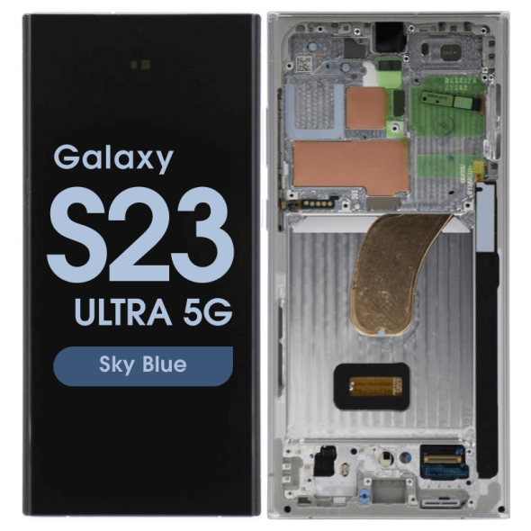 Dynamic AMOLED 2X 6.8" 1440x3088 complete display with frame for Galaxy S23 Ultra SM‑S918B in lime/sky blue; Gorilla Glass Victus 2; service pack quality.