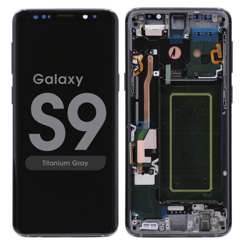 Complete display assembly GH97‑21697EC / GH97‑21696C for Galaxy S9 SM‑G960F in titanium grey; service pack quality.