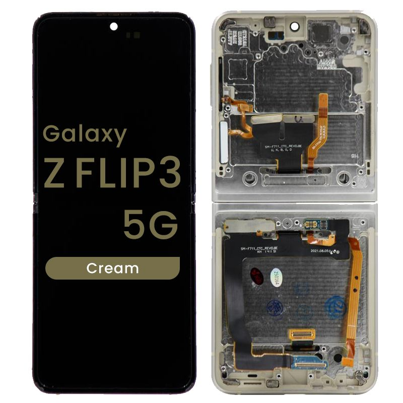 Inner display complete with frame (camera excluded) GH82‑27243B/GH82‑26273B for Galaxy Z Flip3 SM‑F711B in cream; service pack quality.